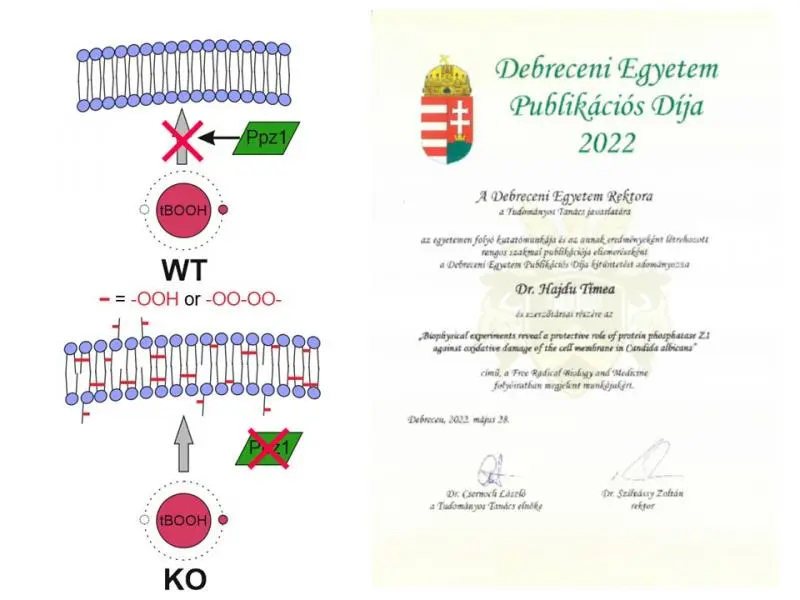 On 28th May, 2022 the paper „Tímea Hajdu, Krisztina Szabó, Ágnes Jakab, István Pócsi, Viktor Dombrádi, Peter Nagy: Biophysical experiments reveal a protective role of protein phosphatase Z1 against oxidative damage of the cell membrane in Candida albicans. Free Radical Biology & Medicine, S0891-5849(21)00741-3. (2021), IF: 7.376” based on a collaborative study of three research groups of the University received the Publication Award of the University of Debrecen. This Award honors the best publication that appeared in the last year from the University of Debrecen, Faculty of Medicine. In this article we describe that the fungus specific protein phosphatase Z1 enzyme (Ppz1) protects the plasma membrane of the opportunistic pathogen, Candida albicans from the damage elicited by an oxidizing agent (tBOOH), and suggest that it may become a suitable target for a perspective antifungal treatment. https://www.sciencedirect.com/science/article/pii/S0891584921007413